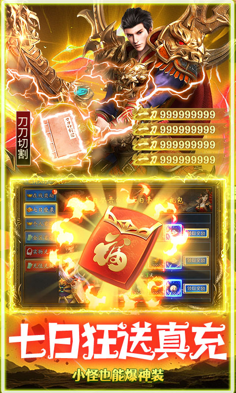 1.创角即送切割神装;会员卡;10万元宝。 2.天天送200充:每天赠送200元充值货币 3.登录送充值卡:七日登录送88累充卡(可激活线上累充)。 4.超级贵族:打怪收集碎片直升满级。 5.洪荒神器:完成指定任务就能免费领取,可获取大量真充和特权。 6.0元装扮:完成目标任务免费激活。 7.实物兑换:兑换可获取充值点,充值点可充值兑换灵符和累充额度。 8.免费首充:领取88累充卡可直接激活首充礼包。 9.每日福利:完成任务每日可获取大量元宝和实物(可兑换充值点) 10.活动玩法:超多活动玩法,参与即可获取大量材料、充值红包、装备等;更有跨服活动等你探索