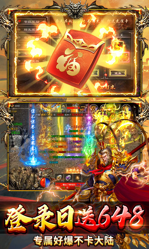 1.上线福利:创角即送齐天大圣限定时装,送首充、群体切割、自动回收,自动范围拾取 2.登录福利:首次登录送西游战神称号、次日登录送哪吒三太子限定时装 3.天天648:每天登录游戏免费领取648充值卡 4.亿万灵符:零氪玩传奇,首杀BOSS狂送万元充值 5.超值回收:极品装备官方回收,海量灵符元宝疯狂送 6.打怪抽奖:杀怪即可免费抽奖,真充、仙位、神装所有道具免费领! 7.全新版本:送满VIP、群魔妖兽、战宠等你来体验!